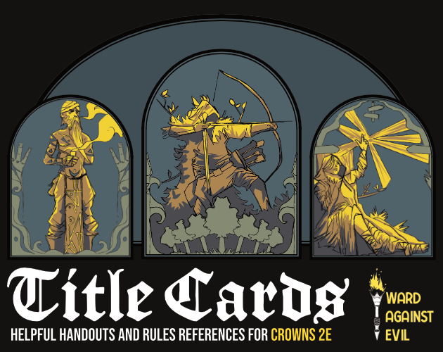 Handouts for each of the 36 Titles in the Core Rules along with 6 rules references (3 for Combat, 3 for Camping) each the size of a small card to enhance your games of Crowns 2e.