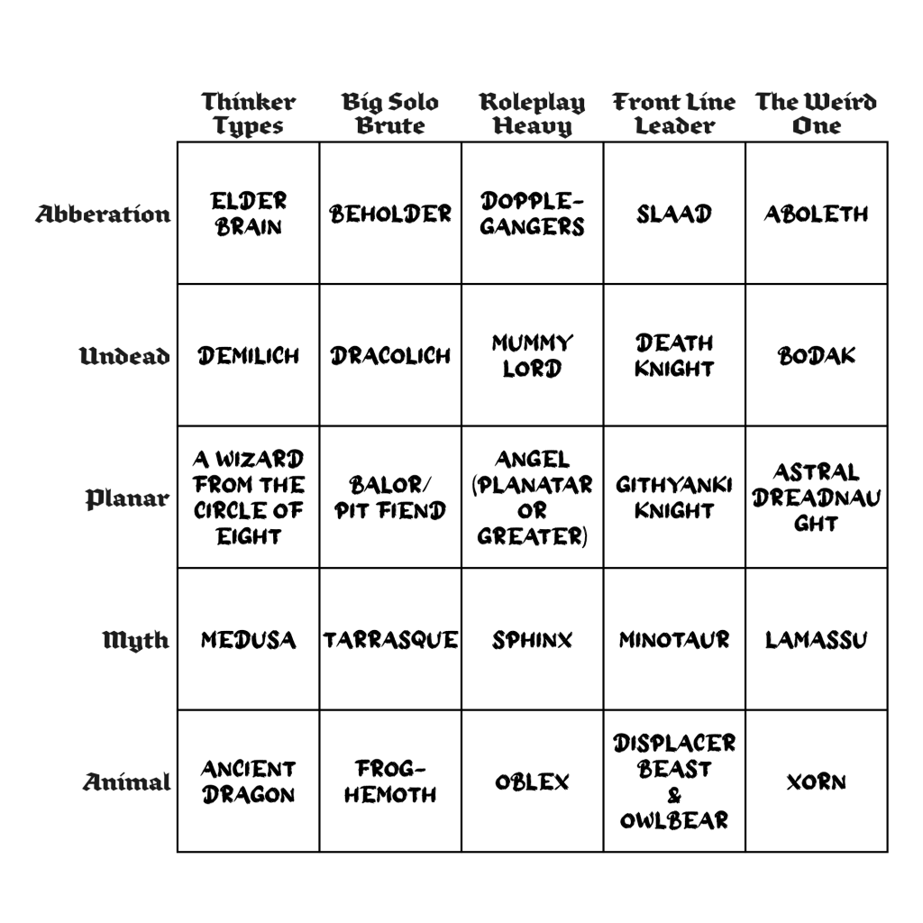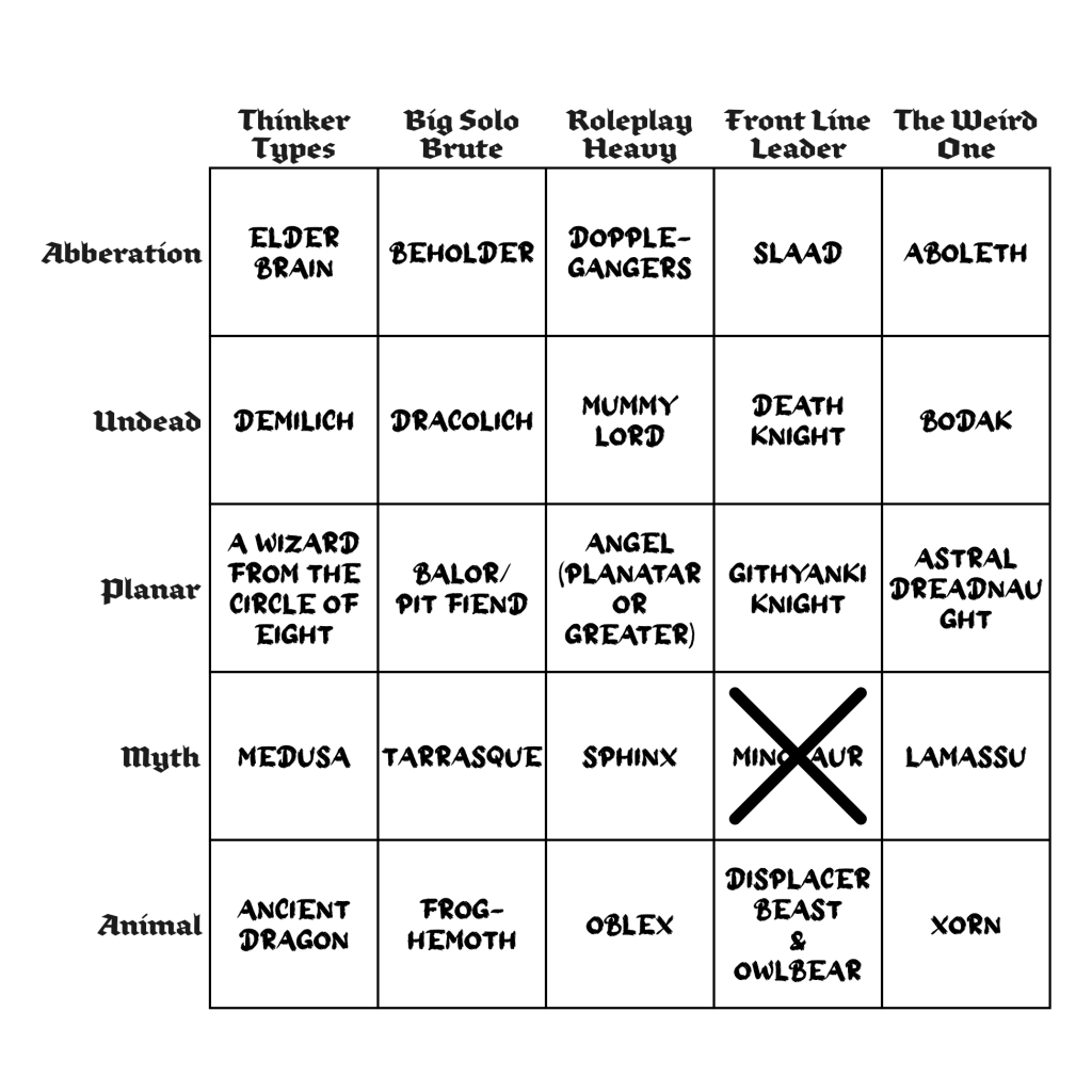 If you notice, none of them are marked except the minotaur. I’ve been playing D&D for over a decade and the only other one of these I’ve encountered or ran is the Owlbear, but NOT the displacer beast (so it doesn’t count).