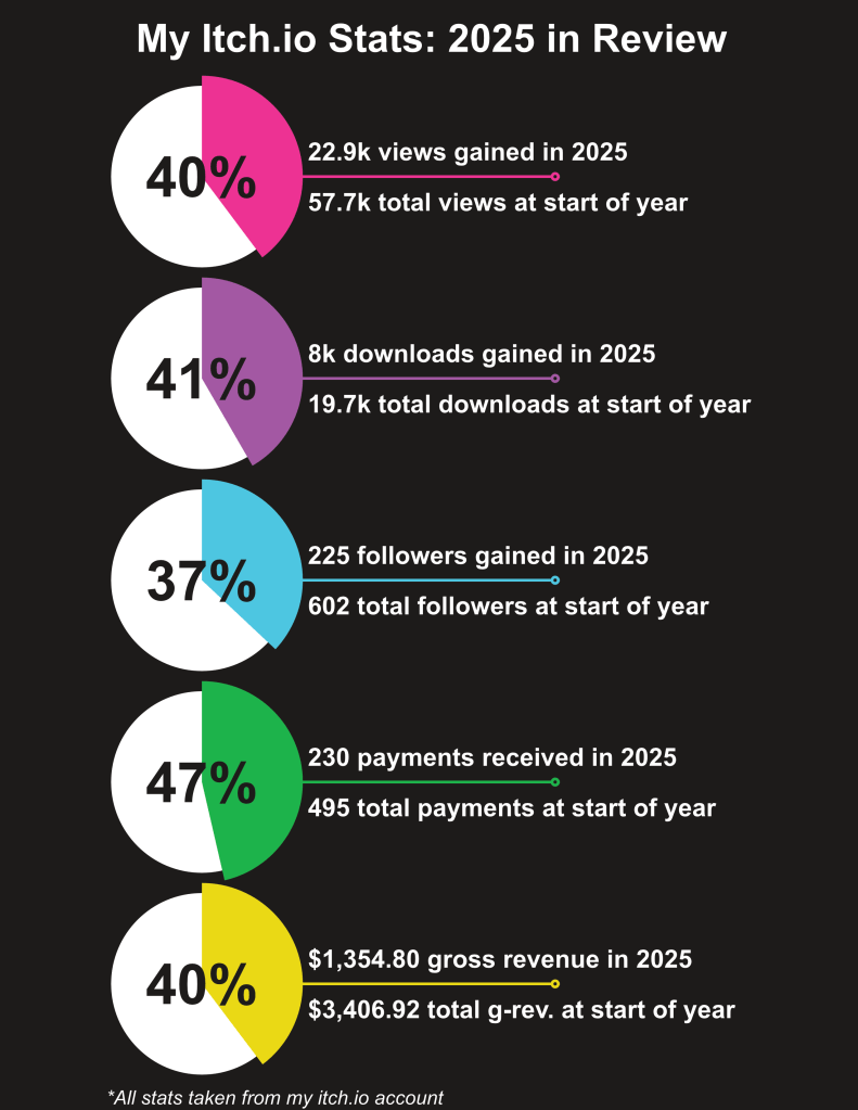 Looking at the numbers, this year I nearly doubled every metric there is. It’s averaging that out of my 5 years of operating on itch.io, in 2025 an average of 41% of every View, Download, Follower, Payment, and Dollar I earned was gained in this one year.